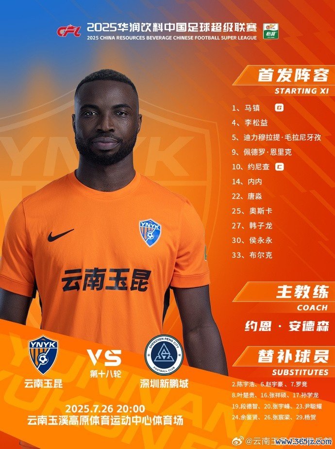 云南玉昆vs深圳新鹏城 本场比赛首发名单