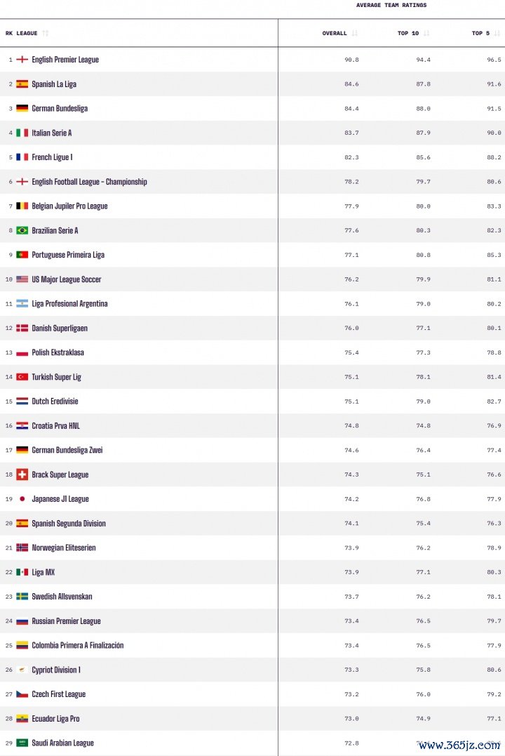 而凭据专科数据机构Opta的最新巨匠联赛实力名次泄露,英超是现在实力最顶尖的联赛,其次是西甲、德甲、意甲以及法甲,英冠位居第六。沙特联名次巨匠第29,落伍于德乙、西乙等联赛。