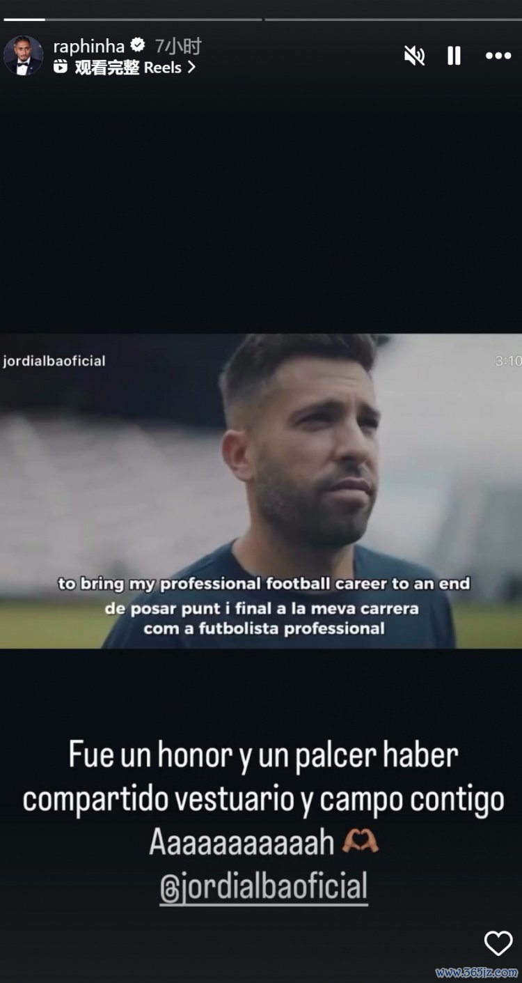 10月8日讯 西班牙边卫阿尔巴将在本赛季甘休后退役,拉菲尼亚社媒发文致意。