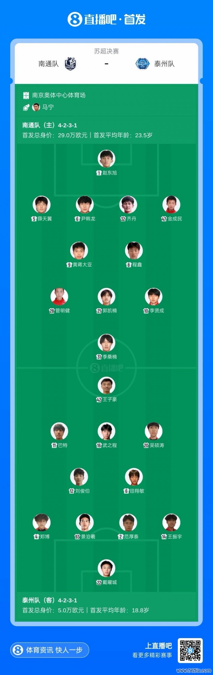 南通队首发:1-赵东旭、5-薛天翼、6-尹韩龙、32-都丹、47-金成民、8-程鑫、10-李贤成、31-季桑楠、9-黄蒋大亚、21-郭凯楠、28-管明健