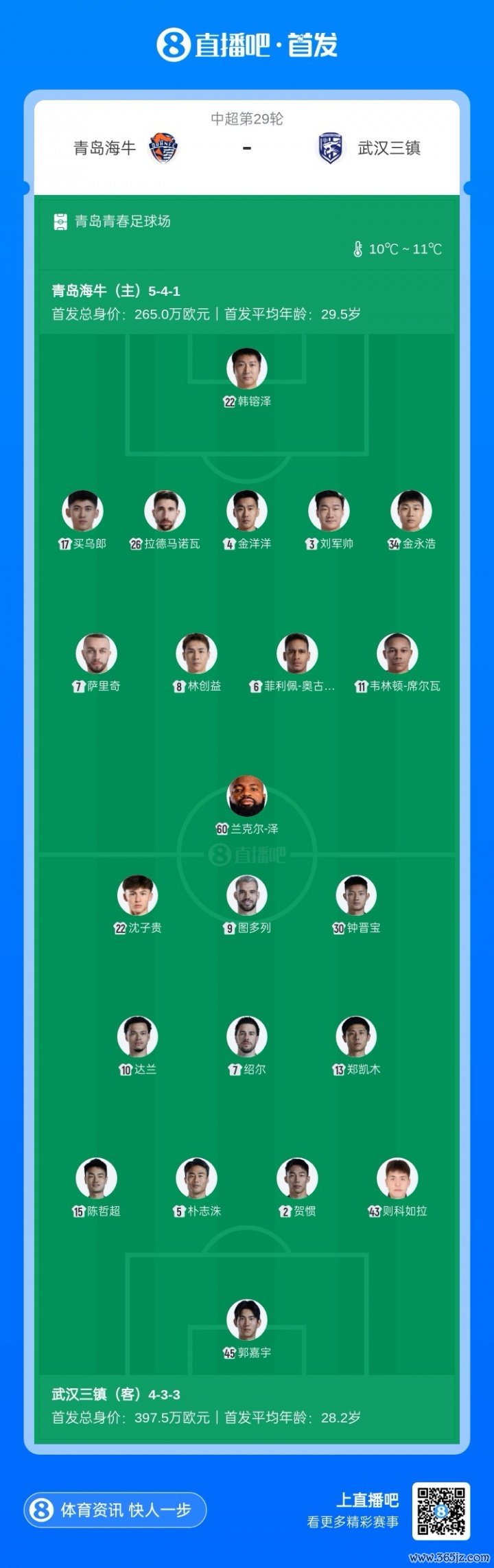 11月02日讯 本日15:30,中超第29轮,青岛海牛主场对阵武汉三镇。赛前,官方公布首发名单。