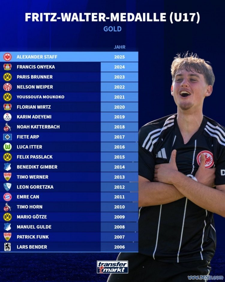 10月17日讯 法兰克福前卫斯塔夫当选德国U17年度最好少壮,德国转会市集列出了往届德国U17年度最好少壮名单。