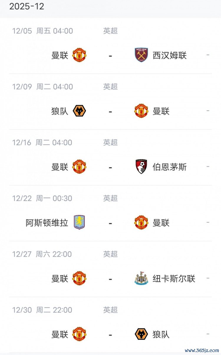 曼联是独逐个支在圣诞节前泄漏进行三场周中英超比赛的球队:12月4日周四主场对西汉姆联,随后周一客战狼队,接着再过几上帝场迎战伯恩茅斯。此外,原定12月27日周六主场对纽卡的比赛也可能被移至节礼日晚间进行。