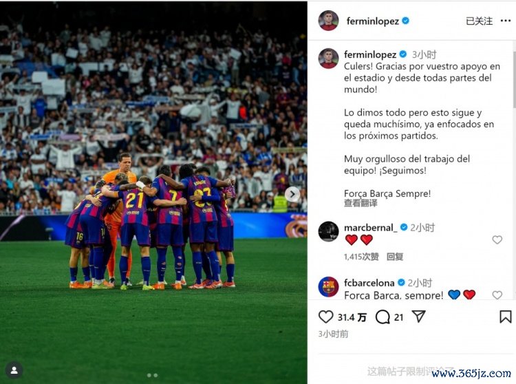 此役费尔明为巴萨破门,赛后他在酬酢媒体上写谈:“巴萨球迷们!感谢你们在球场和天下各地的营救!”