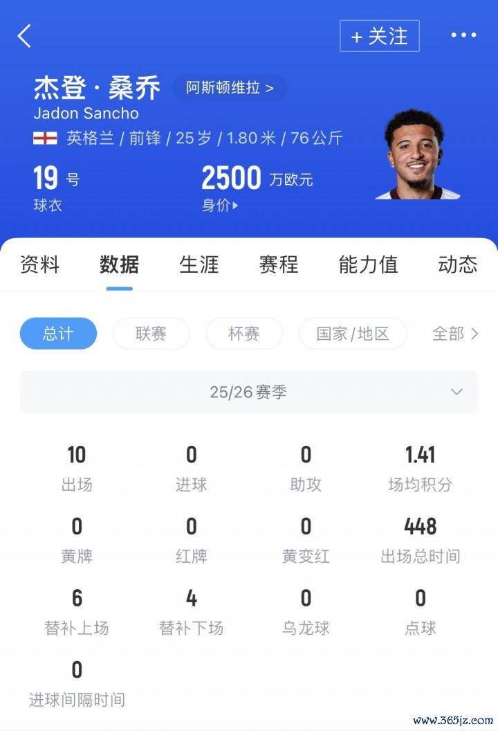 今夏租赁维拉于今,25岁的桑乔各项赛事出场10次,0球0助处境难过。此前据《邮报》的报谈,桑乔租赁时刻,维拉需承担其25万英镑周薪的80%(即20万镑)。