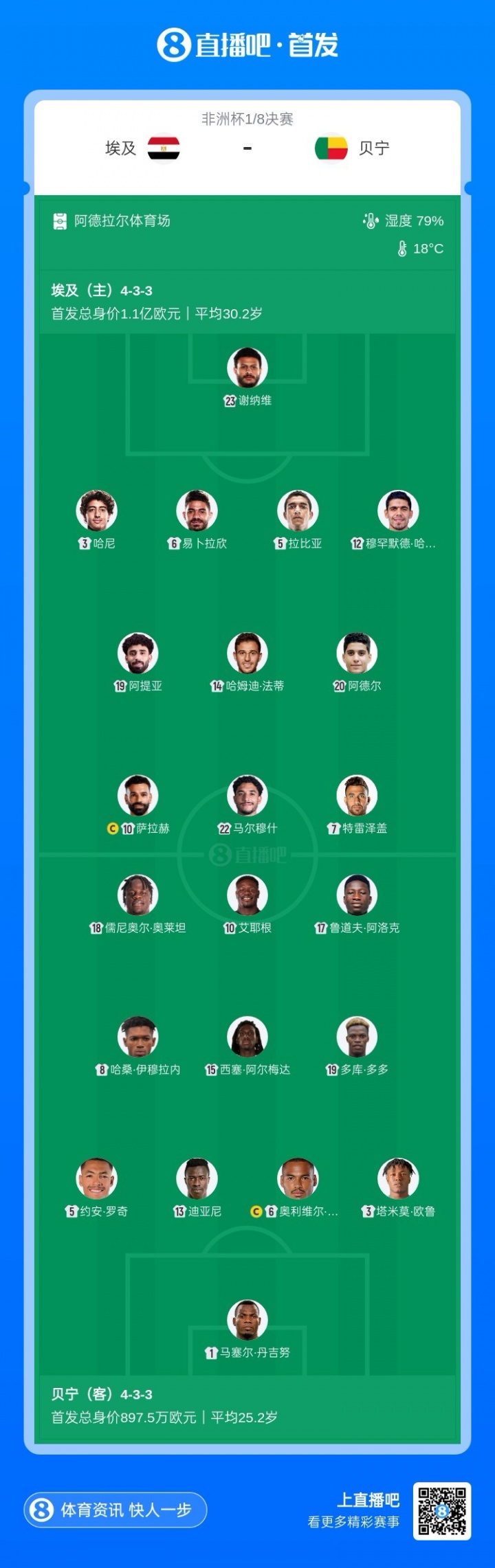 埃及首发:埃及首发:23-谢纳维、3-哈尼、6-易卜拉欣、5-拉比亚、12-哈姆迪、19-阿提亚、14-哈姆迪·法蒂、20-阿德尔、10-萨拉赫、22-马尔穆什、7-特雷泽盖