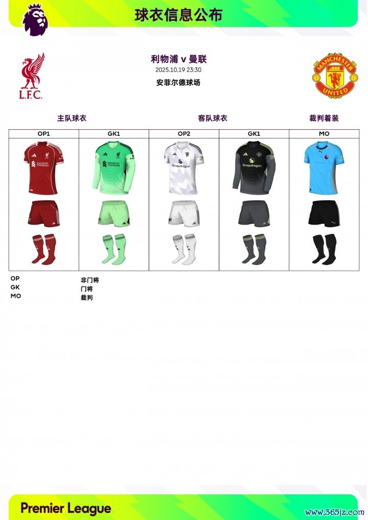 第8轮球衣信息:曼联身穿白色二客作客利物浦