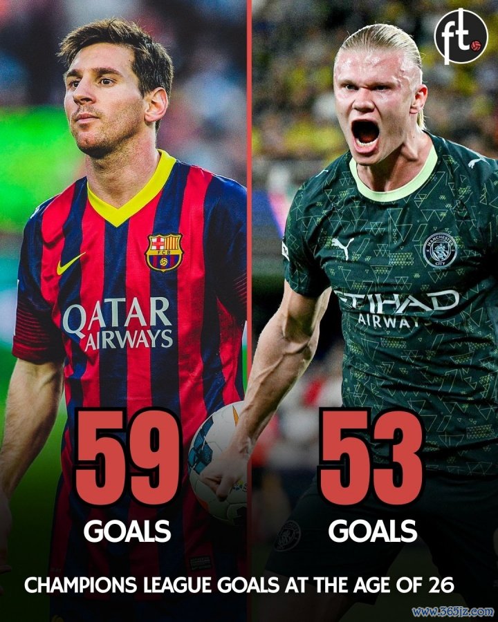 据统计,哈兰德26岁前在欧冠打进53球,仅次于打进59球的梅西。
