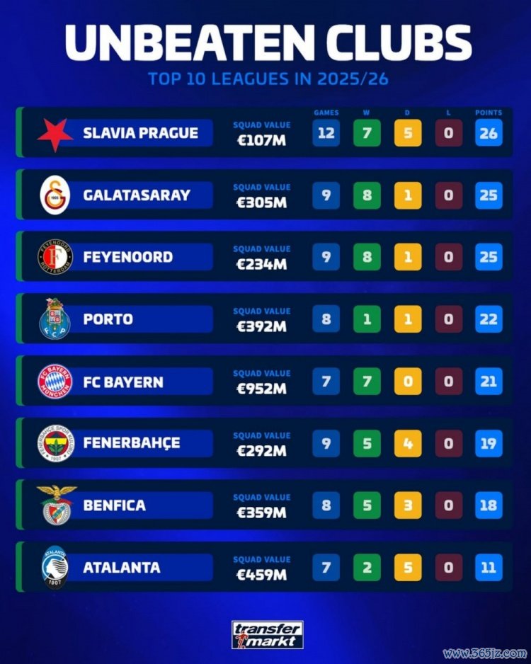 10月25日讯 德转盘货了欧洲前十联赛当今仍保握不败的球队,统共8队,其中五大联赛仅剩拜仁、亚特兰大。具体如下: