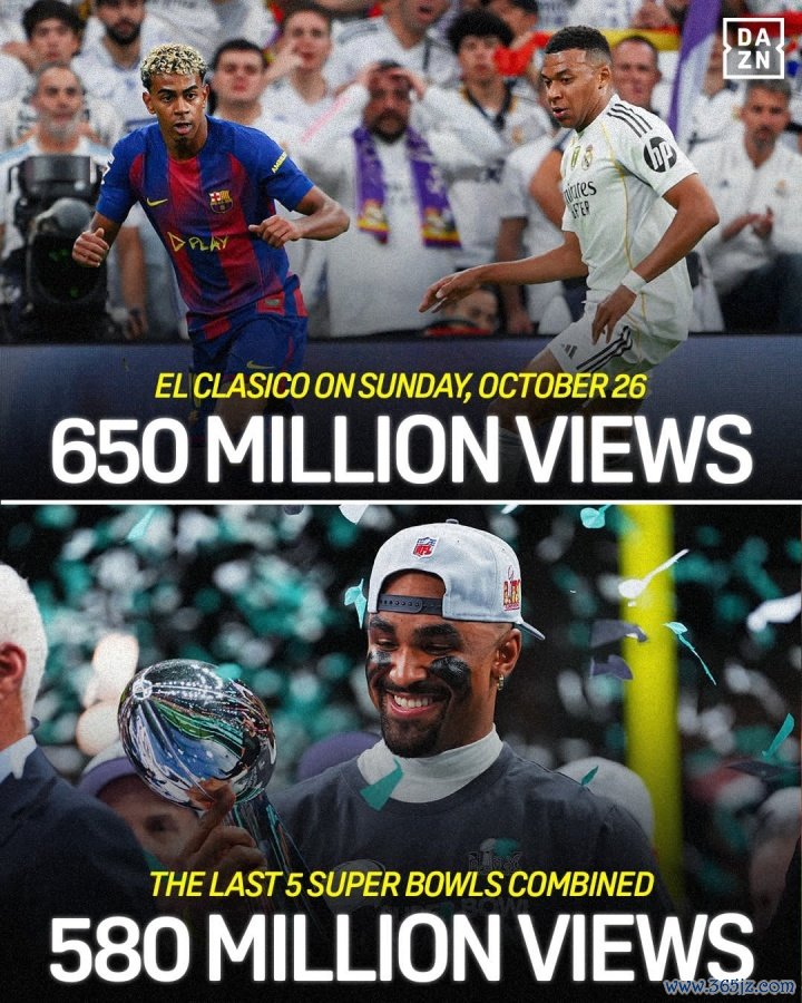 10月30日讯 据闻明转播商DAZN报说念,上场西班牙国度德比,皇马2-1慑服巴萨的比赛。宇宙经营不雅看达到6.5亿东说念主次,独特近5届超等碗收视率之和,近5届超等碗经营不雅看东说念主次约为5.8亿。