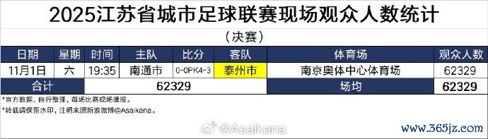 首届苏超今晚终止,泰州队决赛通过点球大战打败南通队夺冠,当天南京奥体中心上座62329东说念主,创中国业余足球比赛现场不雅世东说念主数新记录,该数字以致擢升本赛季劳动联赛的单场最高不雅世东说念主数(京沪德比62291东说念主)。