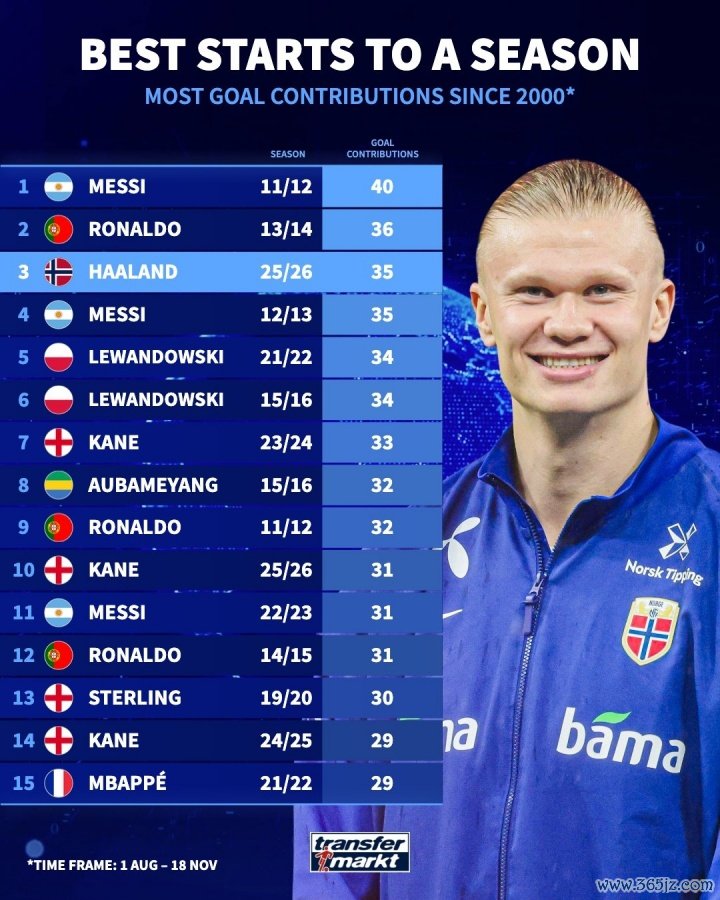 11月20日讯 德转统计了本世纪赛季开局的进球孝顺数,哈兰德以35粒进球位居历史第三,仅次于梅西和C罗。