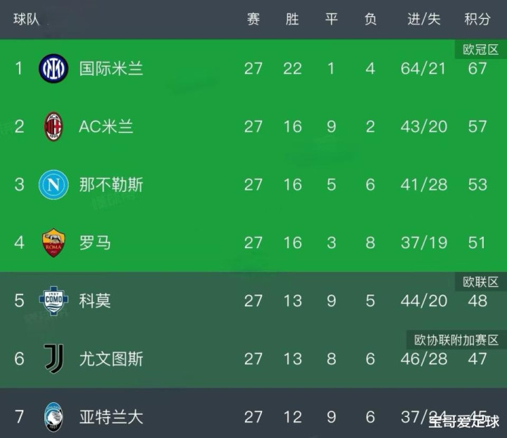 意甲第27轮过后,国米在赛季排名次序榜上已经一骑绝尘而去,距离队史第21个意甲第一名已经越来越近;第2名AC米兰虽然追上国米的希望不大,但由于领先第5名科莫9分之多,进入意甲前四应该问题不大。意甲最后11轮,最大的悬念就是除了米兰双雄以外,还有哪两支战队能够进入意甲前四名,从而获得下比联赛季欧洲足球赛事杯参赛资格。目前看来,那不勒斯、罗马、科莫、尤文图斯和亚特兰大这5支战队将会上演惨烈的争四大战,其中尤文和罗马在第27轮战平称得上是两败俱伤,也让本轮获胜的科莫坐收渔翁之利,积分超过尤文图斯,距离第4名罗马也只有3分之差,堪称本比联赛季意甲最大黑马。