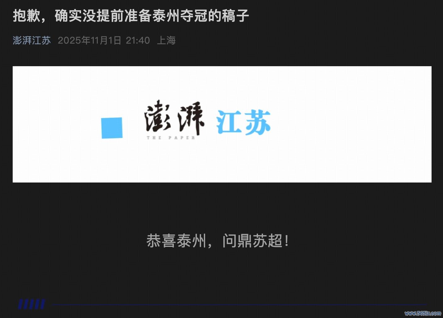 澎湃江苏公众号发文,《对不起,如实没提前准备泰州夺冠的稿子》,并在正文只写了8个字:恭喜泰州,问鼎苏超!