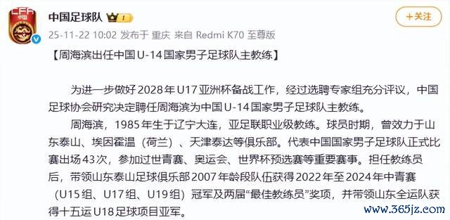周海滨讲求出任中国U-14国度须眉足球队主练习了,他要携带U14国足去冲击2028年U17亚洲杯了。