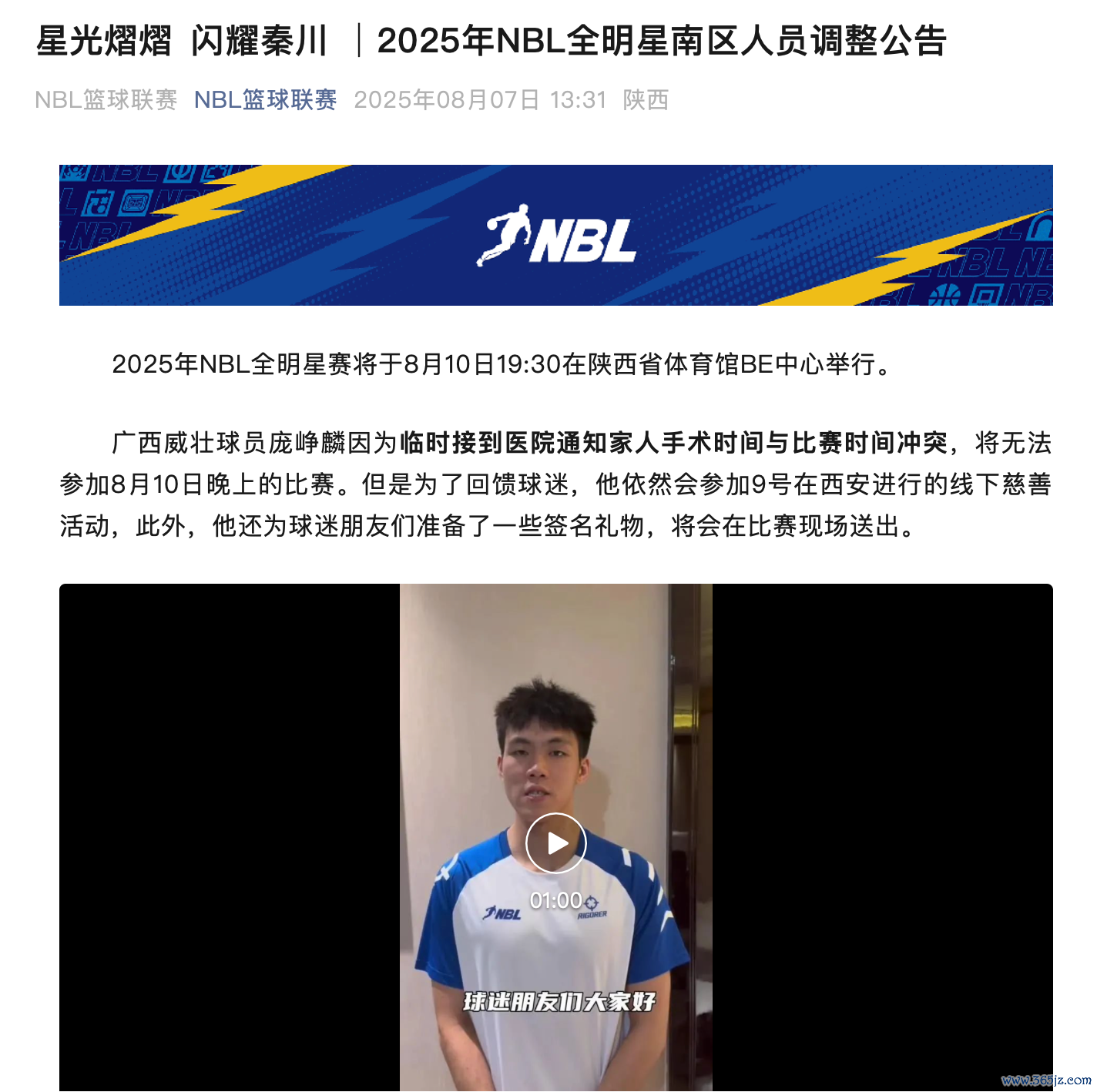 公告示意:2025年NBL全明星赛将于8月10日19:30在陕西省体育馆BE中心举行。广西威壮球员庞峥麟因为临时接到病院示知家东谈主手术时辰与比赛时辰打破,将无法参加8月10日晚上的比赛。